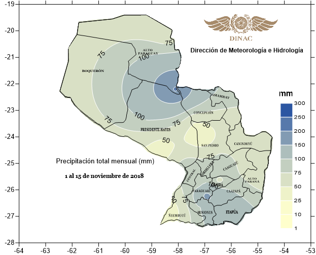 Las lluvias en el mes de noviembre se concentraron en el norte del país alcanzando valores históricos. En la localidad de Puerto Casado el total de precipitación acumulada mensual fue de 481,5 mm estableciendo una diferencia de 321,1 mm en relación a la normal para este mes, con la particularidad de que en un solo día (6 de noviembre) llovió 139,0 mm.Noviembre con lluvias extremas en el norte del país