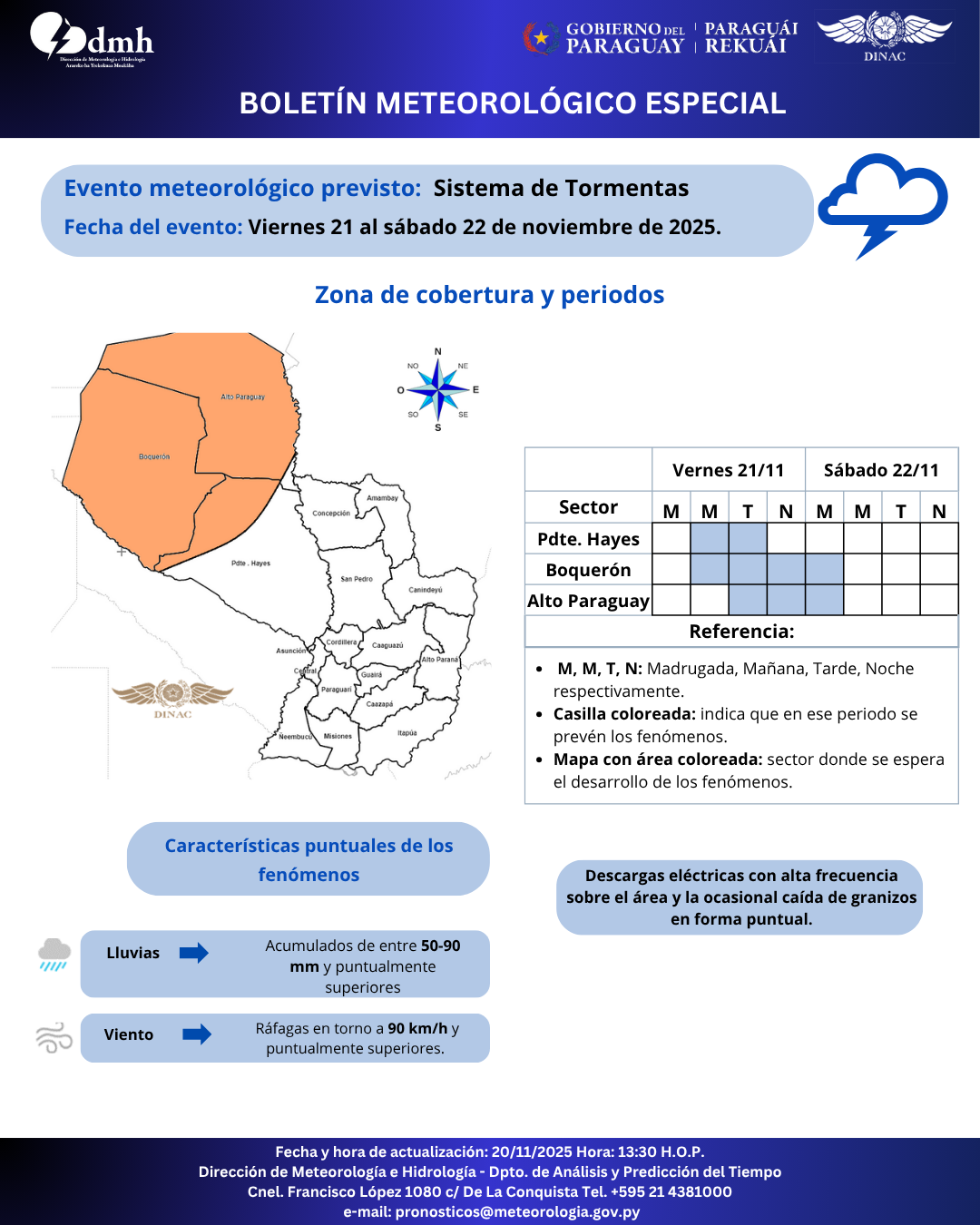 Un sistema de Tormentas estará afectando la Región Occidental del País. Este sistema estaría afectando durante el viernes 21 a la mañana en el Norte del Departamento de Presidente Hayes y suroeste del Departamento de Boquerón. Se espera que esta tormenta traiga muchas descargas eléctricas con acumulados entorno a los 50 mm y 90 mm e incluso puntualmente superiores.